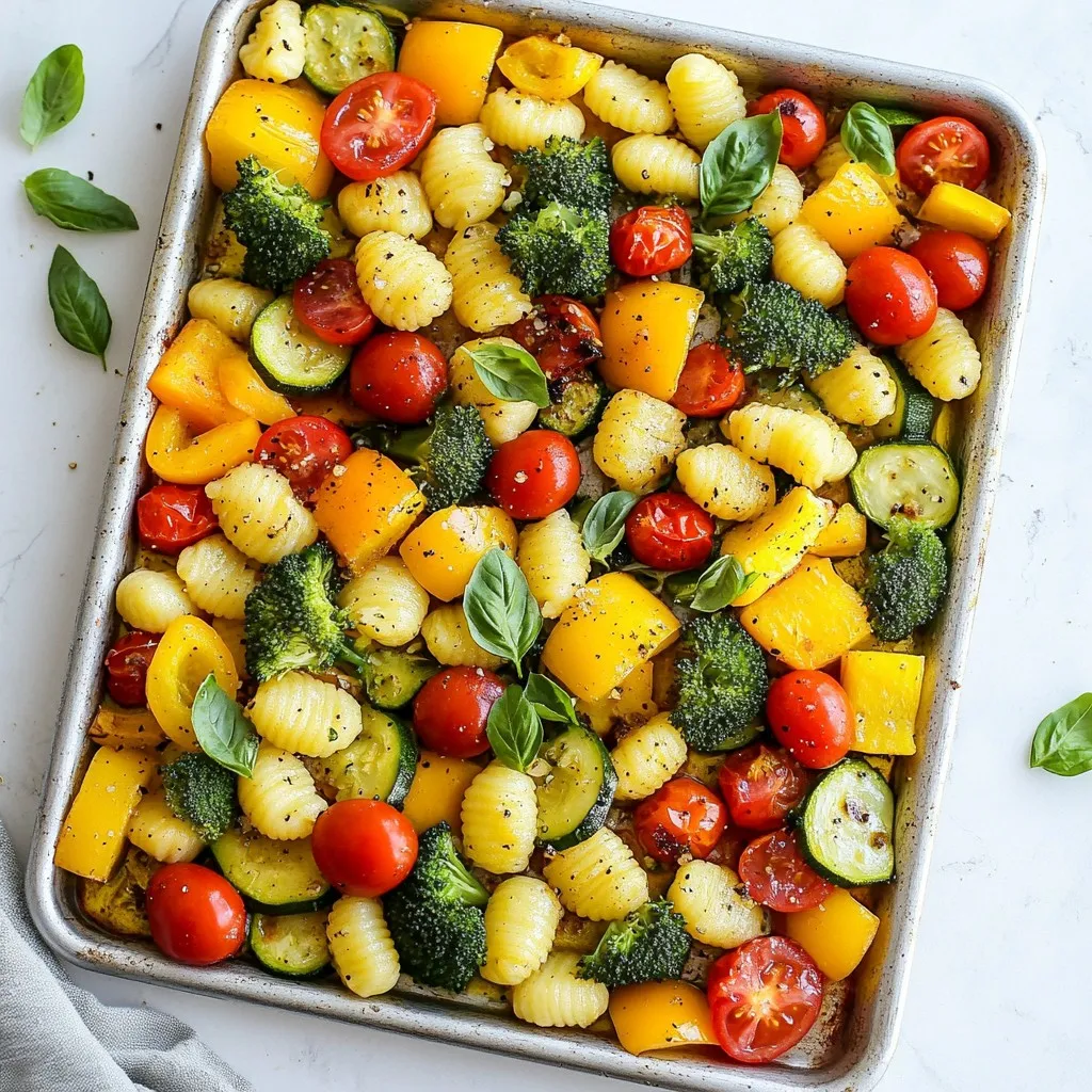 A vibrant and easy sheet pan dish featuring gnocchi and a variety of fresh vegetables.