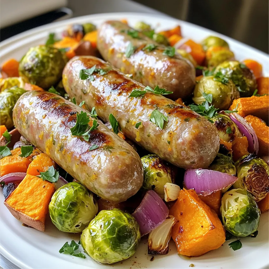 The main ingredients create a colorful and filling dish. The sausages bring rich flavor while the veggies add texture and nutrition. I love using Brussels sprouts and sweet potatoes for their sweet, nutty taste.