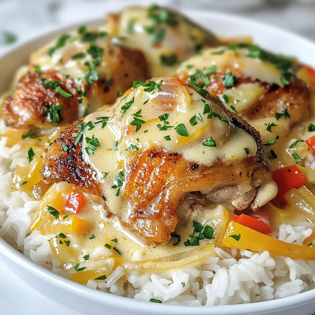 A comforting dish featuring seasoned chicken thighs cooked with rice and creamy broth.