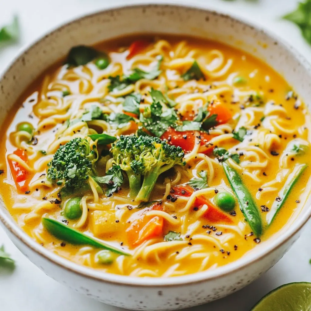 To create the perfect Vegan Coconut Curry Ramen, you need some key ingredients: - 2 packets of ramen noodles (vegan) - 1 can (400ml) coconut milk - 2 tablespoons red curry paste - 1 cup vegetable broth - 1 tablespoon soy sauce or tamari - 1 tablespoon fresh ginger, grated - 2 cloves garlic, minced - 1 cup broccoli florets - 1 red bell pepper, sliced - 1 cup snap peas - 1 carrot, julienned - 2 green onions, chopped - Fresh cilantro, for garnish - Lime wedges, for serving - Salt and pepper to taste These ingredients are simple yet packed with flavor. Each item plays a role in making this dish vibrant and tasty. Garnishes can elevate your ramen experience. Consider adding: - Sliced red chili for heat - Sesame seeds for crunch - Extra lime wedges for zest - Avocado slices for creaminess These optional garnishes can add a personal touch to your ramen. They boost flavor and make your dish look stunning. If you can't find something or want to switch it up, here are some great substitutes: - Use coconut cream instead of coconut milk for a richer taste. - Swap the red curry paste for green curry paste for a different flavor. - Try other veggies like zucchini or spinach based on what you have. - If you're avoiding soy, use coconut aminos instead of soy sauce or tamari. These substitutions keep the dish delicious and allow you to use what's on hand. Cooking should always be flexible! {{ingredient_image_1}} Start by heating a drizzle of vegetable oil in a large pot over medium heat. Add minced garlic and grated ginger. Sauté these for about a minute until they smell great. Next, stir in two tablespoons of red curry paste. Cook this for another minute to let the flavors mix well. Now, pour in one can of coconut milk and one cup of vegetable broth. Stir everything together and bring the mixture to a gentle simmer. This base will give your ramen a rich and creamy flavor. While the base simmers, it’s time to add some color and crunch. Toss in one cup of broccoli florets, one sliced red bell pepper, one cup of snap peas, and one julienned carrot. Cook these veggies for about 5 to 7 minutes. You want them to be tender but still crisp. This ensures they keep their nutrients and texture. While the vegetables cook, prepare the ramen noodles. Follow the package instructions for cooking. Once done, drain the noodles and set them aside. After your veggies are ready, add one tablespoon of soy sauce or tamari to the pot. Season with salt and pepper to your liking. Finally, add the cooked ramen noodles to the pot. Gently toss everything to combine. Serve your Vegan Coconut Curry Ramen hot, garnished with chopped green onions, fresh cilantro, and a lime wedge on the side. Enjoy this savory and simple meal! To make the best ramen broth, start with fresh ingredients. Use coconut milk for creaminess and depth. Red curry paste gives it a rich flavor. Combine these with vegetable broth for a solid base. Always taste as you go. Adjust with soy sauce for saltiness. If you want a little zing, add a squeeze of lime. This brightens the flavors and makes the broth shine. Keep your veggies tender-crisp. This means they should be bright and a bit crunchy. Add them to the pot after making the broth. Broccoli, bell peppers, and snap peas cook quickly. Stir them in and watch closely. They will need about 5 to 7 minutes on medium heat. Don’t overcook them; you want them vibrant and fresh. A splash of cold water after cooking can help keep that color. To amp up the taste, use fresh ginger and garlic. They add warmth and spice to the dish. Also, fresh cilantro brings a nice finish. Don’t skip the lime wedges; they give a perfect burst of flavor. You can also add chili flakes if you like heat. Lastly, play with the broth seasoning. Try adjusting salt and pepper to your liking. Each small change can transform your ramen. Pro Tips Use Fresh Ingredients: Fresh vegetables will enhance the flavor and texture of your ramen. Always opt for seasonal produce when possible. Adjust Spice Levels: If you enjoy a bit more heat, feel free to add some chili flakes or fresh sliced chilies along with the red curry paste. Customize Your Toppings: Experiment with different toppings like avocado, bean sprouts, or toasted sesame seeds to elevate your ramen experience. Make It Ahead: This curry broth can be made in advance and stored in the fridge for up to three days. Just reheat and add the noodles when ready to serve. {{image_2}} Want a kick? Add some heat! You can make spicy vegan coconut curry ramen by adding more red curry paste. Start with two tablespoons, then taste. If you want more heat, add a bit at a time. You can also toss in some sliced fresh chili peppers. They add flavor and spice. Don't forget to adjust the salt. Use less if you add more curry paste. If you're gluten-free, don’t worry! You can still enjoy this dish. First, look for gluten-free ramen noodles. Many brands offer them now. You can also use rice noodles if you can't find gluten-free ramen. When you choose soy sauce, use tamari instead. Tamari is a great gluten-free option. Your meal will still taste amazing! Need more protein? Add tofu or chickpeas. Firm tofu works well. Cut it into cubes and sauté it before adding it to the pot. This gives it a nice texture. If you prefer chickpeas, drain and rinse a can. Toss them in with the veggies. They soak up the curry flavor. Both options make your meal filling and tasty. After you enjoy your Vegan Coconut Curry Ramen, store any leftovers in an airtight container. Make sure to let the ramen cool before sealing it. This way, it stays fresh and tasty. Leftovers can last in the fridge for up to three days. To reheat, pour the ramen into a pot. Add a splash of vegetable broth to prevent it from drying out. Heat it on medium-low, stirring often until hot. You can also use the microwave. Place the ramen in a bowl and cover it. Heat in short bursts, stirring in between, until it’s warm. You can freeze the Vegan Coconut Curry Ramen f