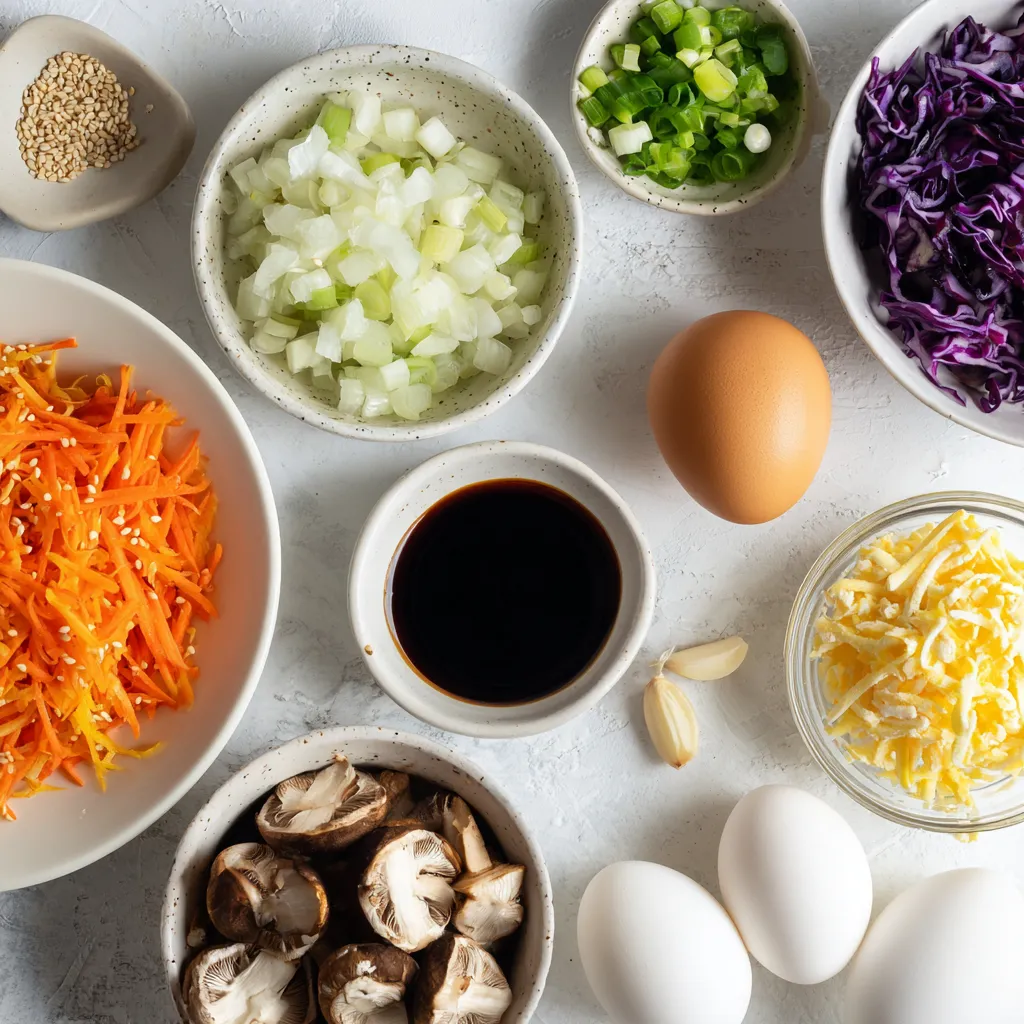 First, gather your ingredients. You need sesame oil, onion, garlic, carrots, cabbage, bell pepper, mushrooms, ginger, soy sauce, rice vinegar, eggs, green onions, and sesame seeds. Chop the onion, garlic, and bell pepper. Shred the carrots and cabbage. Dice the mushrooms. This step makes cooking easier.